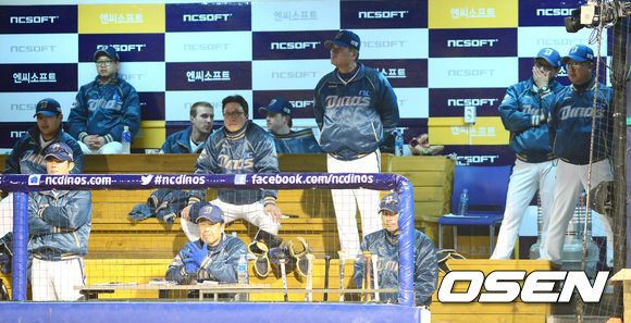 4일 오후 창원 마산구장에서 열린 '2013 한국야쿠르트 세븐 프로야구' NC 다이노스와 롯데 자이언츠의 경기 9회말 2사 허준의 타석, NC 코칭스텝들과 선수들이 경기를 지켜보고 있다.