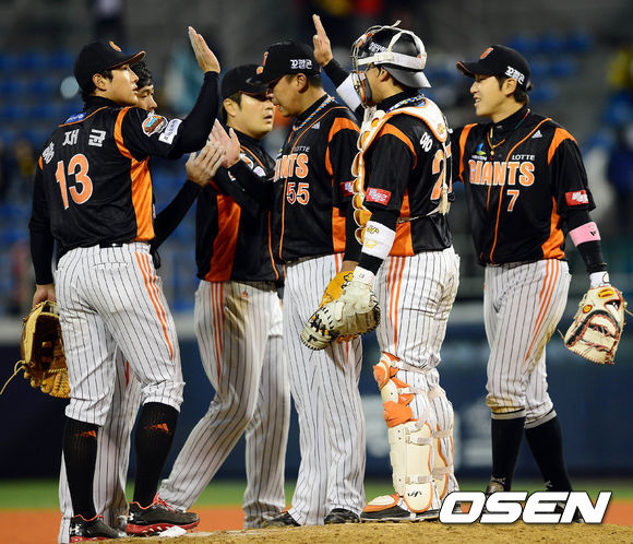 4일 오후 창원 마산구장에서 열린 '2013 한국야쿠르트 세븐 프로야구' NC 다이노스와 롯데 자이언츠의 경기 종료 후 롯데 선수들이 하이파이브를 하고 있다.