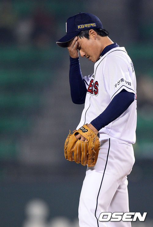 4일 오후 서울 잠실구장에서 열린 2013 한국야쿠르트 세븐 프로야구 두산 베어스와 SK 와이번스의 경기, 8회초 ⅓이닝 동안 4피안타를 허용한 두산 정재훈 투수가 땀을 닦고 있다