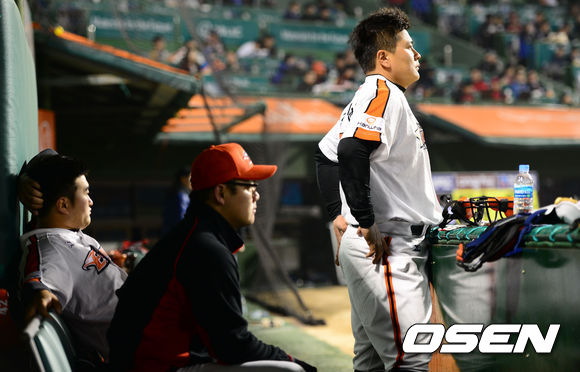 4일 오후 대전 한밭종합운동장 야구장에서 열린 2013 한국야쿠르트 세븐프로야구 한화 이글스와 KIA 타이거즈의 경기, 9회초 한화 김태균과 안승민이 덕아웃에서 경기를 바라보고 있다.