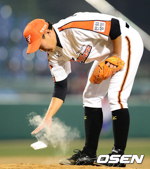4일 오후 대전 한밭종합운동장 야구장에서 열린 2013 한국야쿠르트 세븐프로야구 한화 이글스와 KIA 타이거즈의 경기, 9회초 2사 1,2루에서 한화 김광수가 로진 가루를 만지고 있다.