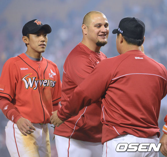 경기종료 후 SK 이만수 감독이 역전 결승 3루타를 날린 이명기, 승리투수가 된 레이예스와 하이파이브를 하고 있다./soul1014@osen.co.kr
