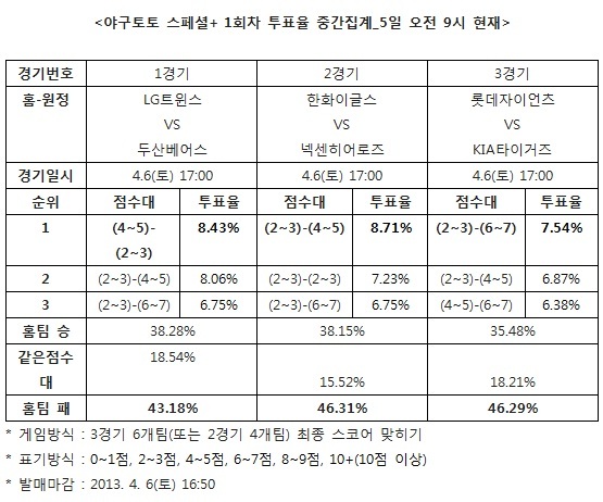 [야구토토] 국민체육진흥공단(www.kspo.or.kr)이 발행하는 체육진흥투표권 수탁사업자인 스포츠토토의 공식 온라인 발매 사이트 베트맨(www.betman.co.kr)이 오는 6일에 열리는 한국프로야구(KBO) 3경기를 대상으로 한 야구토토 스페셜+ 1회차 투표율을 중간 집계한 결과, 참가자의 43.18%는 한지붕 두가족인 LG 트윈스-두산 베어스(1경기)전에서 두산의 승리를 예상했다.
