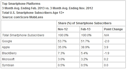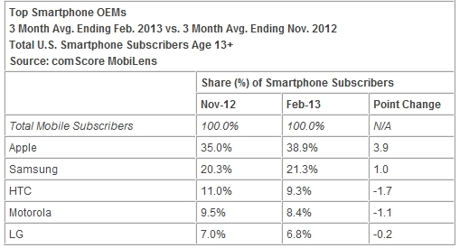이에 애플은 2012년 11월 35%였던 시장 점유율이 2013년 2월에는 38.9%로 증가했으며 뒤를 이은 삼성도 20.3%에서 21.3%로 수치가 늘어났다. 3위에는 HTC가 이름을 올렸으나 점유율은 11.0%에서 9.3%로 하락했으며 4위와 5위에 오른 모토로라와 LG전자도 11월 대비 2월의 수치가 하락했다.