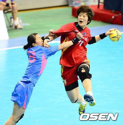 5일 오후 경북 구미 박정희체육관에서 열린 제10회 동아시아클럽핸드볼선수권대회 한국 인천시체육회와 일본 오므론의 경기, 후반 인천시체육회 류은희가 오므론 마유코의 수비를 피해 슛을 시도하고 있다.