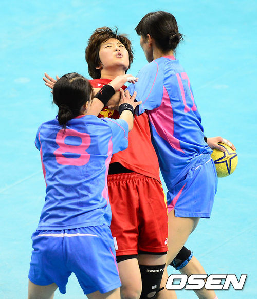 5일 오후 경북 구미 박정희체육관에서 열린 제10회 동아시아클럽핸드볼선수권대회 한국 인천시체육회와 일본 오므론의 경기, 후반 인천시체육회 류은희가 오므론에 반칙을 당하고 있다.
