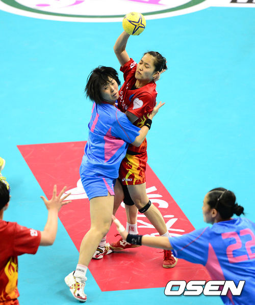 5일 오후 경북 구미 박정희체육관에서 열린 제10회 동아시아클럽핸드볼선수권대회 한국 인천시체육회와 일본 오므론의 경기, 후반 인천시체육회 문필희가 오므론 수비를 피해 동료에게 패스를 시도하고 있다.