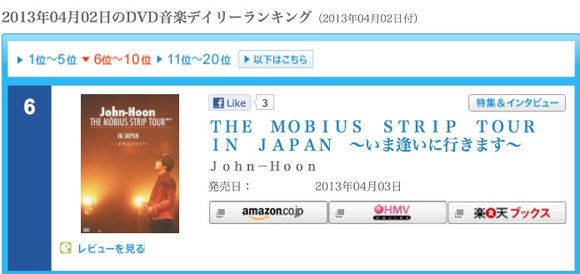5일 오전 김정훈 측은 "지난 3일 발매된 '뫼비우스 스트립 투어 인 재팬(THE MOBIUS STRIP TOUR IN JAPAN)' 라이브 DVD가 발매 당일 오리콘 차트 음악 DVD 데일리 랭킹에서 6위를 차지했다"고 밝혔다.