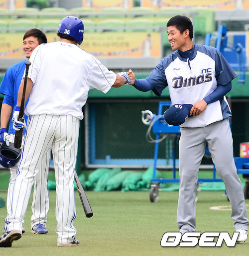 5일 오후 대구시민운동장 야구장에서 열린 2013 한국야쿠르트 세븐프로야구 삼성 라이온즈와 NC 다이노스의 경기, 경기에 앞서 NC 조영훈이 삼성 이승엽과 인사를 나누고 있다.