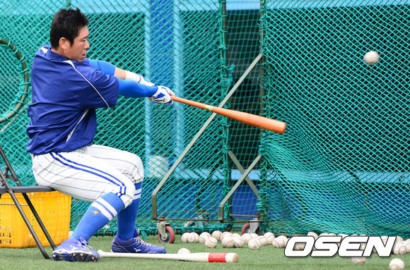 5일 오후 대구시민운동장 야구장에서 열린 2013 한국야쿠르트 세븐프로야구 삼성 라이온즈와 NC 다이노스의 경기, 경기에 앞서 삼성 조동찬이 타격 훈련을 하고 있다.