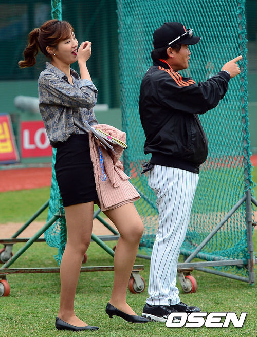 5일 오후 부산 사직구장에서 열리는 '2013 한국야쿠르트 세븐 프로야구' 롯데 자이언츠와 KIA 타이거즈의 경기 시작 전 정인영 아나운서와 박흥식 코치가 이야기를 나누고 있다.