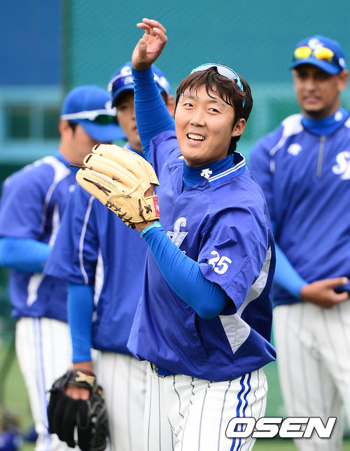 5일 오후 대구시민운동장 야구장에서 열린 2013 한국야쿠르트 세븐프로야구 삼성 라이온즈와 NC 다이노스의 경기, 경기에 앞서 삼성 배영수가 수비 훈련을 하고 있다.