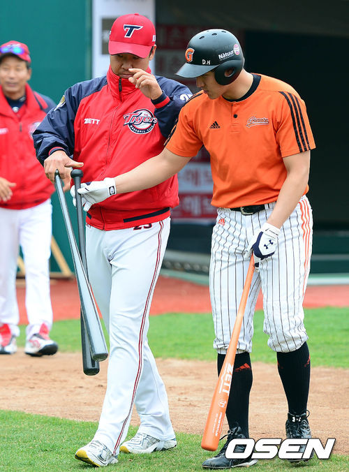 5일 오후 부산 사직구장에서 열리는 '2013 한국야쿠르트 세븐 프로야구' 롯데 자이언츠와 KIA 타이거즈의 경기 시작 전 황재균이 이범호의 배트를 건내받고 있다.