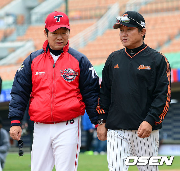 5일 오후 부산 사직구장에서 열리는 '2013 한국야쿠르트 세븐 프로야구' 롯데 자이언츠와 KIA 타이거즈의 경기 시작 전 이순철 코치와 박흥식 코치가 이야기를 나누고 있다.