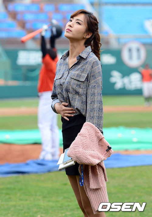 5일 오후 부산 사직구장에서 열리는 '2013 한국야쿠르트 세븐 프로야구' 롯데 자이언츠와 KIA 타이거즈의 경기 시작 전 정인영 아나운서가 한 중계 스텝에게 배고프다는 제스처를 취하고 있다.