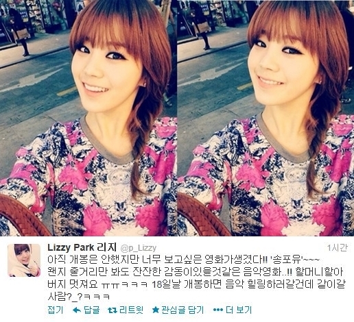 리지는 5일 자신의 트위터에 "아직 개봉은 안 했지만 너무 보고 싶은 영화가 생겼다! '송포유'"라는 글을 올렸다.
