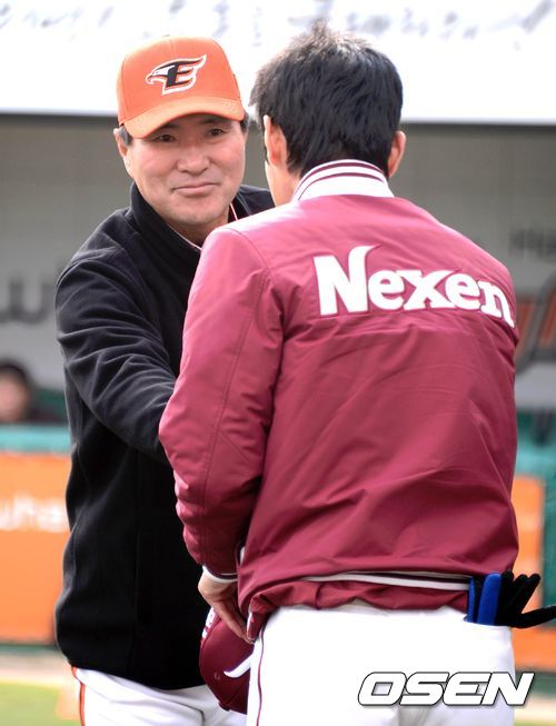 [OSEN=대전, 손용호기자] 5일 대전 한밭야구장에서 한화 이글스와 넥센 히어로즈의 경기 전 염경엽 감독이 김종모 코치와 인사를 나누고 있다.
