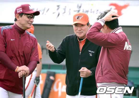 [OSEN=대전, 손용호기자] 5일 대전 한밭야구장에서 한화 이글스와 넥센 히어로즈의 경기 전 김종모 코치가 심재학 이강철 코치와 이야기를 나누고 있다.