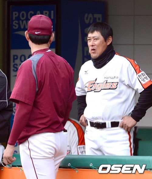 [OSEN=대전, 손용호기자] 5일 대전 한밭야구장에서 한화 이글스와 넥센 히어로즈의 경기 전 이종범 코치가 최상덕 넥센 코치와 이야기를 나누고 있다.