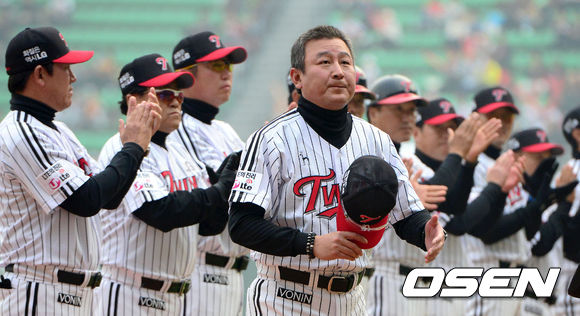 5일 오후 서울 잠실구장에서 열린 '2013 한국야쿠르트 세븐 프로야구' LG 트윈스와 두산 베어스의 경기에 앞서 LG 김기태 감독이 팬들에게 인사를 하고 있다.
