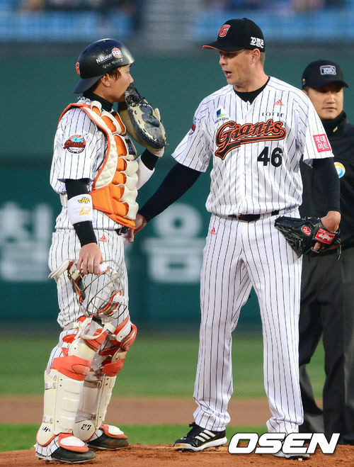 5일 오후 부산 사직구장에서 열린 '2013 한국야쿠르트 세븐 프로야구' 롯데 자이언츠와 KIA 타이거즈의 경기 1회초 옥스프링이 용덕한과 마운드에서 이야기를 나누고 있다.
