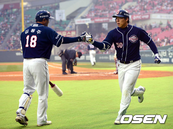 5일 오후 서울 잠실구장에서 열린 '2013 한국야쿠르트 세븐 프로야구' LG 트윈스와 두산 베어스의 경기, 1회초 1사 1루 두산 김현수가 2점홈런을 치고 김동주와 하이파이브를 하고 있다.