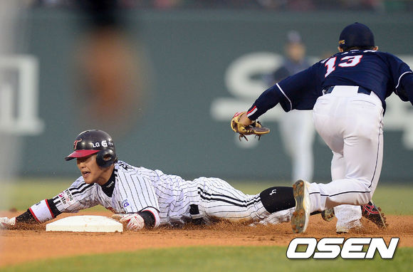 5일 오후 서울 잠실구장에서 열린 '2013 한국야쿠르트 세븐 프로야구' LG 트윈스와 두산 베어스의 경기, 1회말 1사 1루 LG 박용택 타석때 1루주자 정주현이 2루 도루를 성공하고 있다.