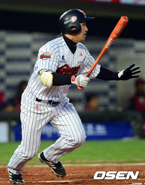 5일 오후 부산 사직구장에서 열린 '2013 한국야쿠르트 세븐 프로야구' 롯데 자이언츠와 KIA 타이거즈의 경기 1회말 1사 3루 손아섭이 1타점 적시타를 치고 있다.