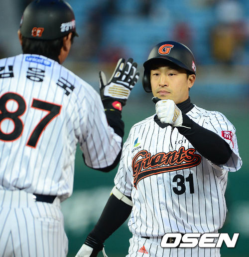 5일 오후 부산 사직구장에서 열린 '2013 한국야쿠르트 세븐 프로야구' 롯데 자이언츠와 KIA 타이거즈의 경기 1회말 1사 3루 손아섭이 1타점 적시타를 치고 김응국 코치와 하이파이브를 하고 있다.