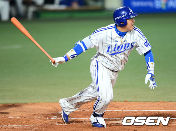 5일 오후 대구시민운동장 야구장에서 열린 2013 한국야쿠르트 세븐프로야구 삼성 라이온즈와 NC 다이노스의 경기, 1회말 무사 1,2루에서 삼성 최형우가 중전 적시타를 치고 있다.