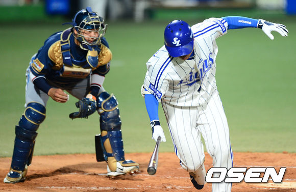 5일 오후 대구시민운동장 야구장에서 열린 2013 한국야쿠르트 세븐프로야구 삼성 라이온즈와 NC 다이노스의 경기, 1회말 1사 1,2루에서 삼성 박한이가 NC 노성호의 몸쪽 공에 놀라고 있다.