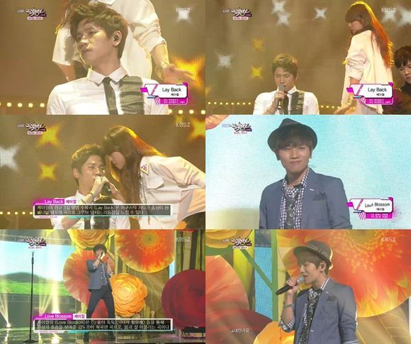 케이윌은 5일 오후 방송된 KBS 2TV '뮤직뱅크'에서 신곡 '레이백(Lay Back)'과 타이틀곡 '러브 블러썸(Love Blossom)'을 열창하며 완벽한 무대를 선사했다.