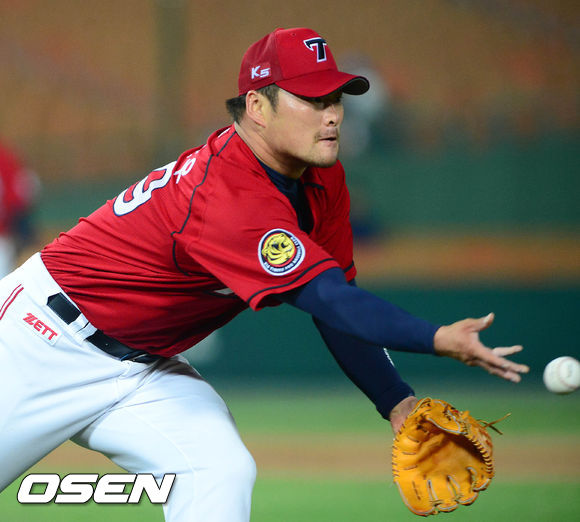 5일 오후 부산 사직구장에서 열린 '2013 한국야쿠르트 세븐 프로야구' 롯데 자이언츠와 KIA 타이거즈의 경기 3회말 선두타자 손아섭의 땅볼을 김진우가 잡아 1루로 송구하고 있다.