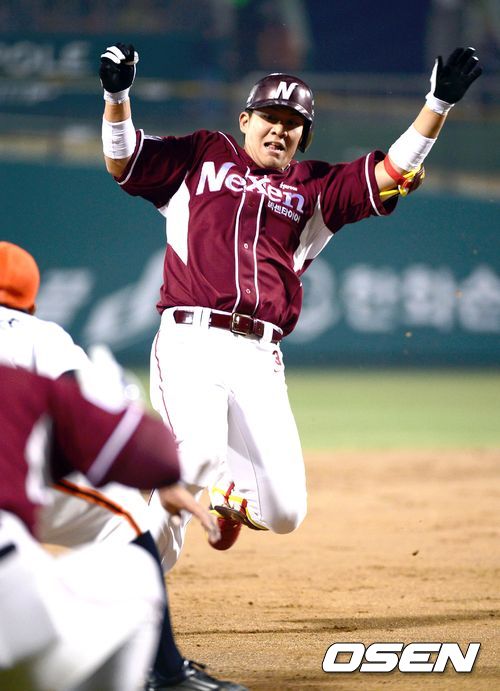 [OSEN=대전, 손용호기자] 5일 대전 한밭야구장에서 벌어진 한화 이글스와 넥센 히어로즈의 경기 4회초 2사 1,2루 김민성이 싹슬이 3루타를 치고 3루에 안착하고 있다.