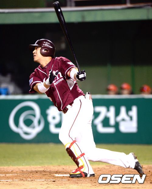 [OSEN=대전, 손용호기자] 5일 대전 한밭야구장에서 벌어진 한화 이글스와 넥센 히어로즈의 경기 4회초 2사 1,2루 김민성이 싹슬이 3루타를 치고 있다.