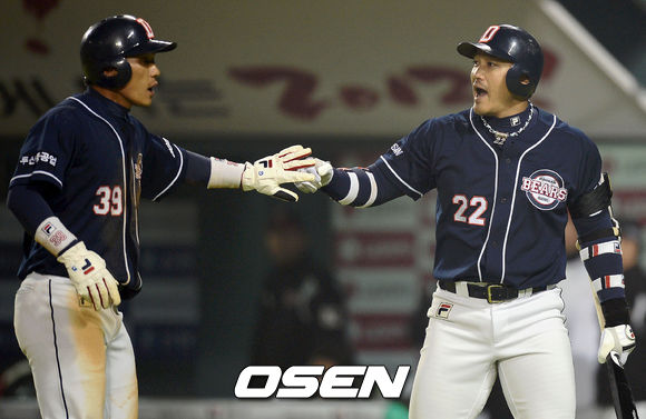 5일 오후 서울 잠실구장에서 열린 '2013 한국야쿠르트 세븐 프로야구' LG 트윈스와 두산 베어스의 경기, 3회초 2사 2,3루 두산 홍성흔이 김동주의 중견수 희생플라이로 득점을 올린 이종욱과 기뻐하고 있다.