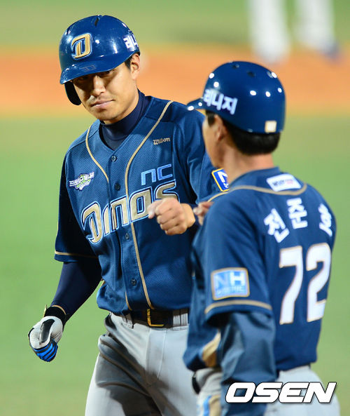 5일 오후 대구시민운동장 야구장에서 열린 2013 한국야쿠르트 세븐프로야구 삼성 라이온즈와 NC 다이노스의 경기, 3회초 무사에서 NC 조영훈이 중전 안타를 치고 전준호 코치와 하이파이브를 하고 있다.