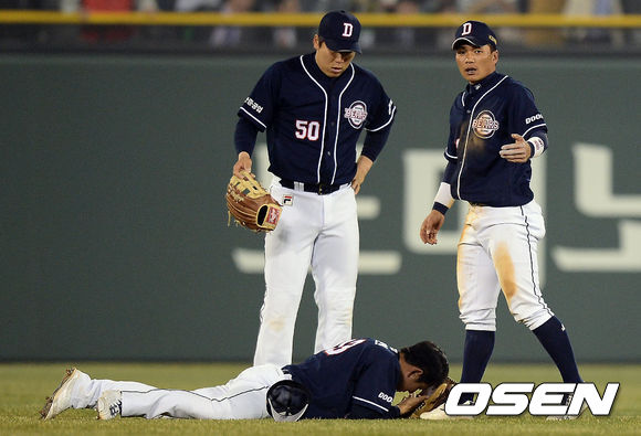 5일 오후 서울 잠실구장에서 열린 '2013 한국야쿠르트 세븐 프로야구' LG 트윈스와 두산 베어스의 경기, 3회말 1사 1루 두산 손시헌이 LG 이진영의 타구를 잡으려다 이종욱과 충돌한 뒤 그라운드에 쓰러져 있다.