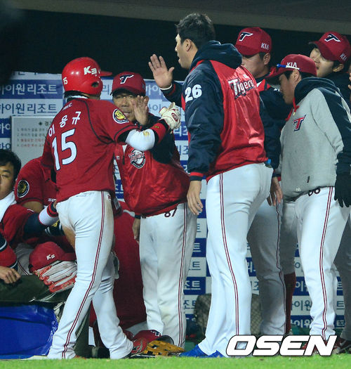 5일 오후 부산 사직구장에서 열린 '2013 한국야쿠르트 세븐 프로야구' 롯데 자이언츠와 KIA 타이거즈의 경기 4회초 2사 2루 신종길의 좌전안타 상황, 3루수 황재균의 실책으로 득점까지 성공한 이용규가 덕아웃에서 동료들과 하이파이브를 하고 있다.