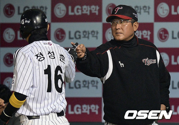 5일 오후 서울 잠실구장에서 열린 '2013 한국야쿠르트 세븐 프로야구' LG 트윈스와 두산 베어스의 경기, 3회말 2사 2,3루 두산 손시헌의 실책으로 LG 정성훈이 득점을 올린 뒤 김기태 감독과 기뻐하고 있다.