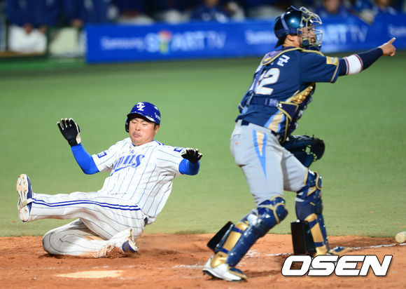 5일 오후 대구시민운동장 야구장에서 열린 2013 한국야쿠르트 세븐프로야구 삼성 라이온즈와 NC 다이노스의 경기, 3회말 무사 1,2루에서 삼성 진갑용의 우전 적시타 때 홈으로 쇄도한 2루주자 박한이가 세이프 되고 있다.