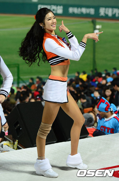 5일 오후 부산 사직구장에서 열린 '2013 한국야쿠르트 세븐 프로야구' 롯데 자이언츠와 KIA 타이거즈의 경기, 치어리더 박기량이 공연을 펼치고 있다.