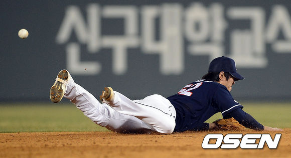 5일 오후 서울 잠실구장에서 열린 '2013 한국야쿠르트 세븐 프로야구' LG 트윈스와 두산 베어스의 경기, 4회말 2사 2루 두산 김재호가 LG 박용택의 타구를 잡기위해 슬라이딩 캐치를 시도하였지만 아쉽게 놓치고 있다.