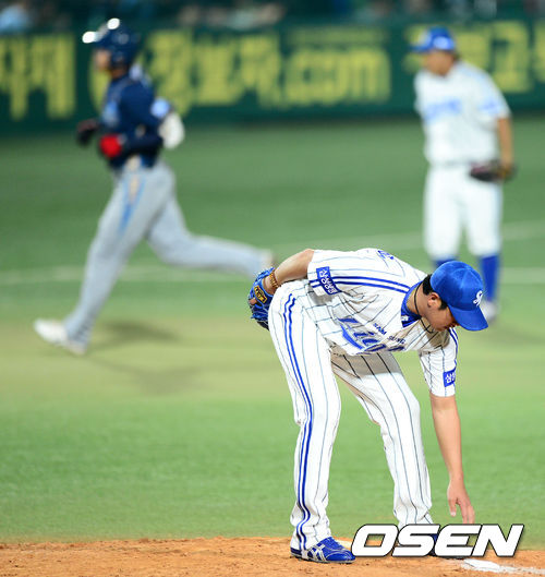 5일 오후 대구시민운동장 야구장에서 열린 2013 한국야쿠르트 세븐프로야구 삼성 라이온즈와 NC 다이노스의 경기, 5회초 무사에서 NC 조평호에게 좌월 솔로 홈런을 허용한 삼성 장원삼이 로진가루를 만지고 있다.