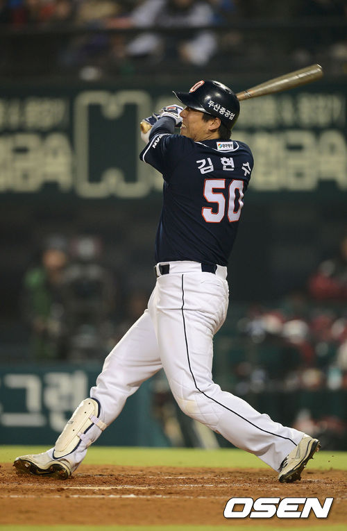 5일 오후 서울 잠실구장에서 열린 '2013 한국야쿠르트 세븐 프로야구' LG 트윈스와 두산 베어스의 경기, 5회초 2사 1루 두산 김현수가 1타점 2루타를 때리고 있다.