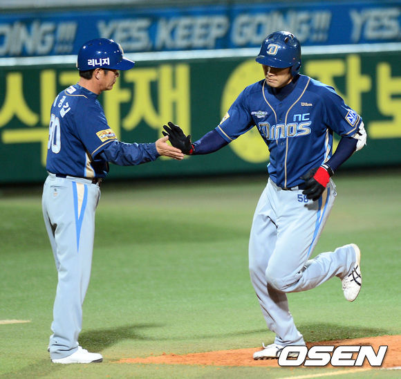 5일 오후 대구시민운동장 야구장에서 열린 2013 한국야쿠르트 세븐프로야구 삼성 라이온즈와 NC 다이노스의 경기, 5회초 무사에서 NC 조평호가 좌월 솔로 홈런을 치고 그라운드를 돌며 환호하고 있다.