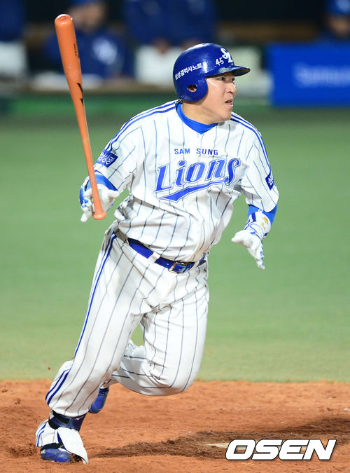 5일 오후 대구시민운동장 야구장에서 열린 2013 한국야쿠르트 세븐프로야구 삼성 라이온즈와 NC 다이노스의 경기, 5회말 2사 만루에서 삼성 최형우가 우전 2타점 적시타를 치고 있다.