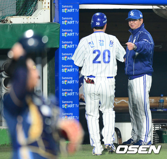 5일 오후 대구시민운동장 야구장에서 열린 2013 한국야쿠르트 세븐프로야구 삼성 라이온즈와 NC 다이노스의 경기, 5회말 2사 만루에서 삼성 최형우의 우전 2타점 적시타 때 홈을 밟은 3루주자 진갑용이 덕아웃에서 류중일 감독의 축하를 받고 있다.