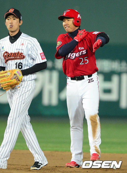 5일 오후 부산 사직구장에서 열린 '2013 한국야쿠르트 세븐 프로야구' 롯데 자이언츠와 KIA 타이거즈의 경기, 7회초 1사 2루 이범호가 1타점 2루타를 치고 2루 베이스에 서있다.