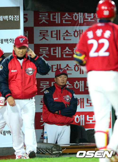 5일 오후 부산 사직구장에서 열린 '2013 한국야쿠르트 세븐 프로야구' 롯데 자이언츠와 KIA 타이거즈의 경기 7회초 1사 만루 안치홍의 1타점 적시타 상황, 선동렬 감독이 덕아웃에서 선수들을 바라보고 있다.